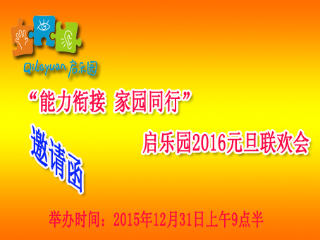 同時啟樂園“2016元旦聯歡會”將于本周四上午9點半舉行,強烈要求以家庭為單位集體前來為孩子們助威,我們一起“共迎新年”!最后提前祝您,2016新年快樂!